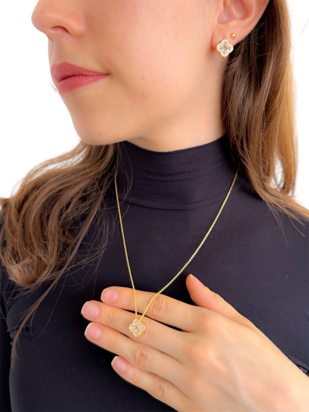 Adicione um Toque de Elegância ao Seu Estilo! O Conjunto Trevo Cravejado Banho Ouro 18k é a escolha perfeita para quem deseja brilhar em qualquer evento. Não perca a oportunidade de incorporar essa peça incrível à sua coleção!